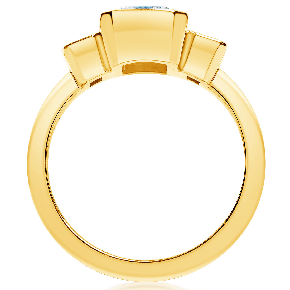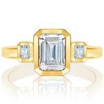 This engagement ring features an emerald center and sidestones, each set in a bezel. A simple, high polish band comletes this look. Image features a 2ct center stone.