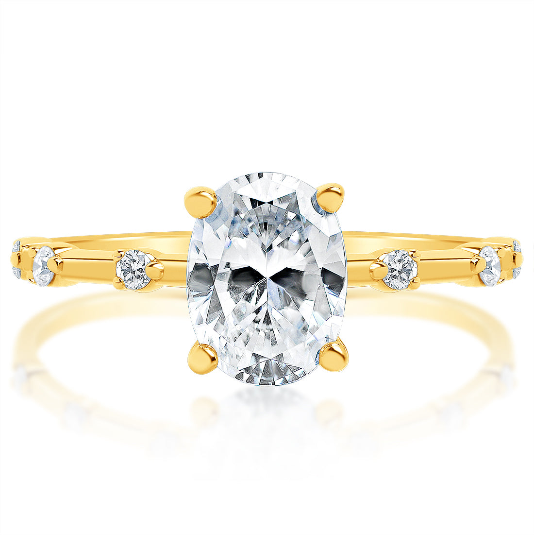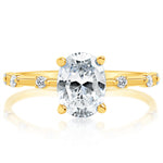 Unit price perThis engagement ring features an oval diamond center stone. The band is a high polish band and also features diamonds which are spaced out on the band in a shared prong setting. Image features a 1ct center stone.