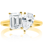 Unit price perThis engagement ring is designed in a toi et moi, double stone style with emerald and pear shaped center stones. Each of the stones are cathedral set and feature a high polish finish on the band. Image features a 1.25ct pear diamond and a 2ct emerald diamond.
