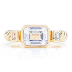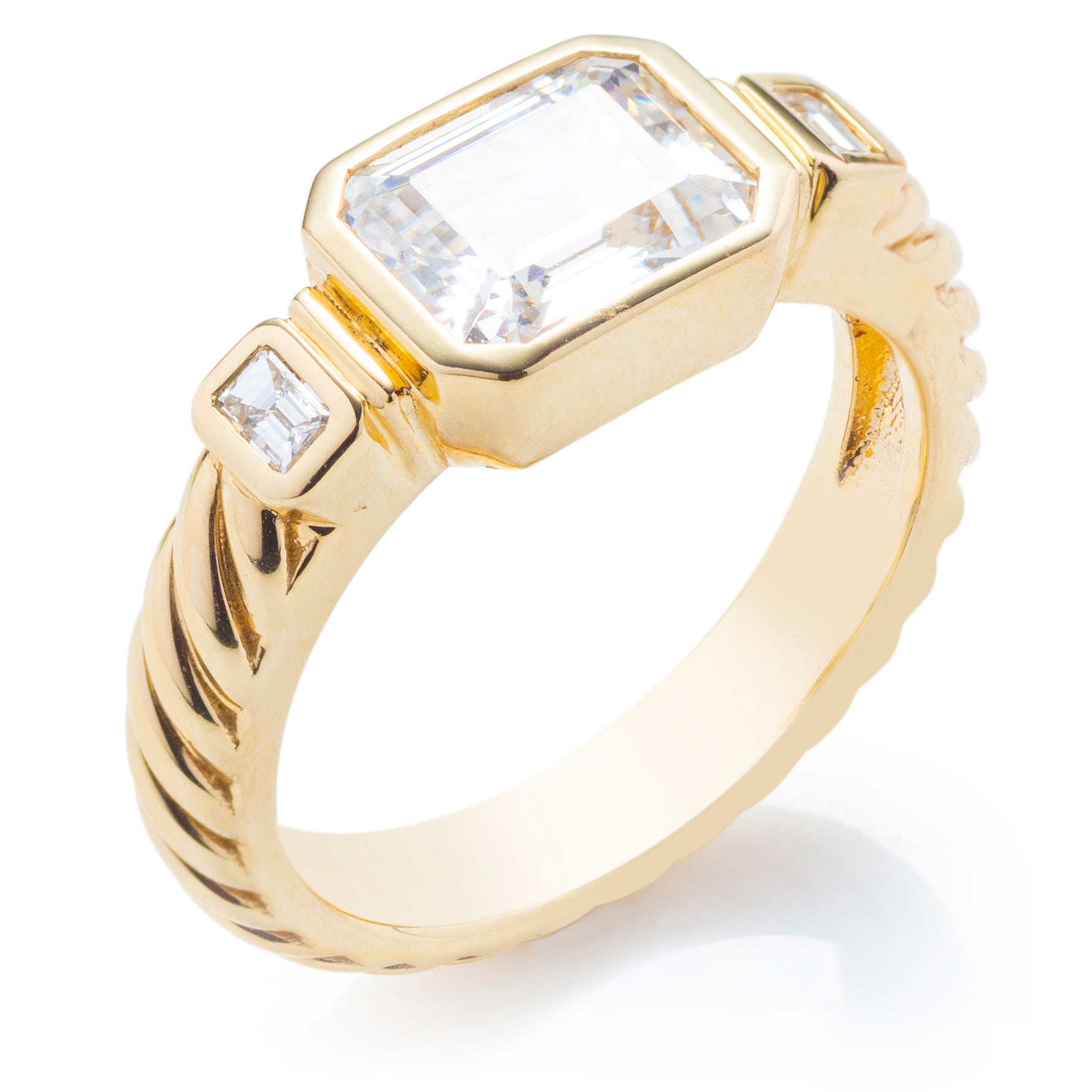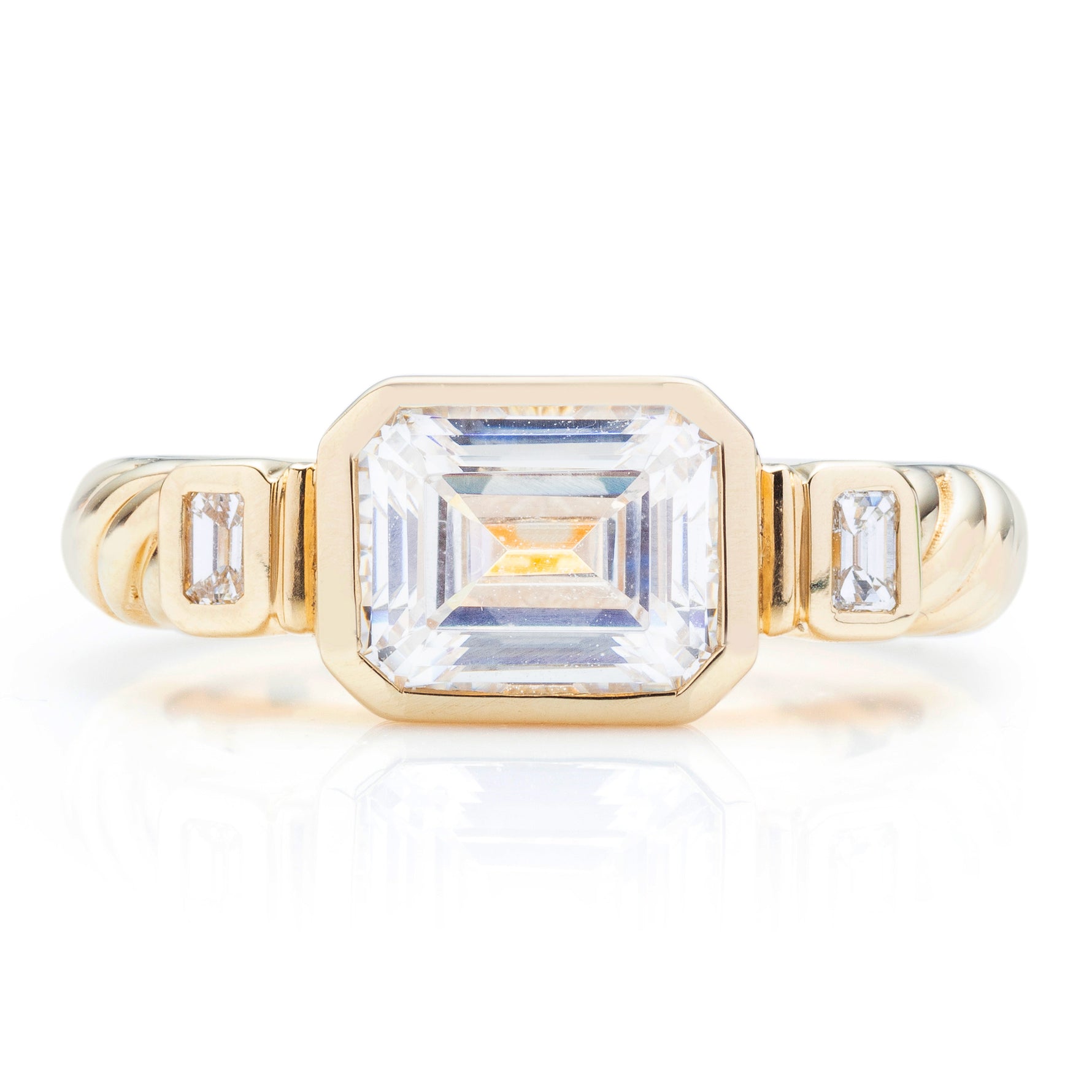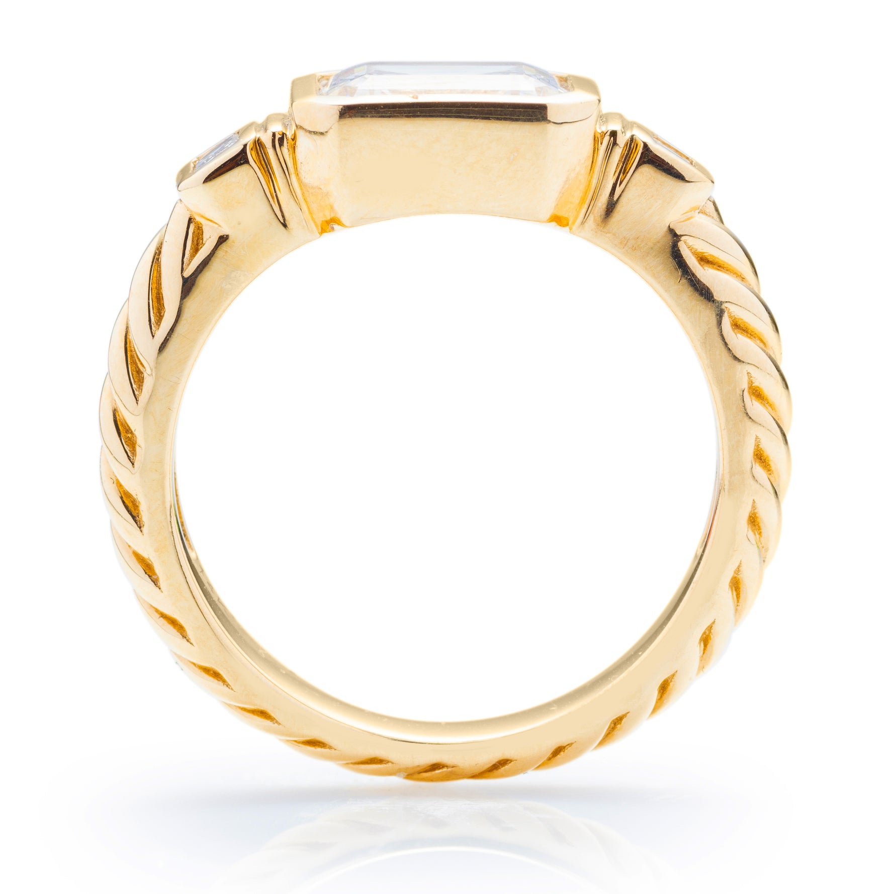 Unit price perThis engagement ring features an emerald diamond center stone which is set east-west and bezel set. On either side of the center stone sits an emerald cut diamond which is bezel set. The shank features a twisting rope design which goes all the way around the ring. Image features a 2ct center stone.