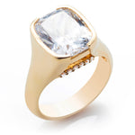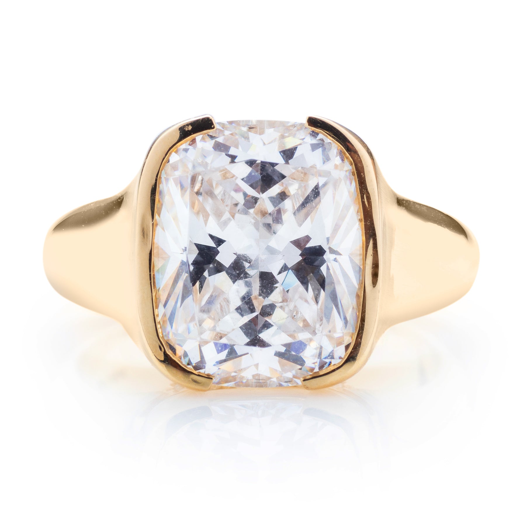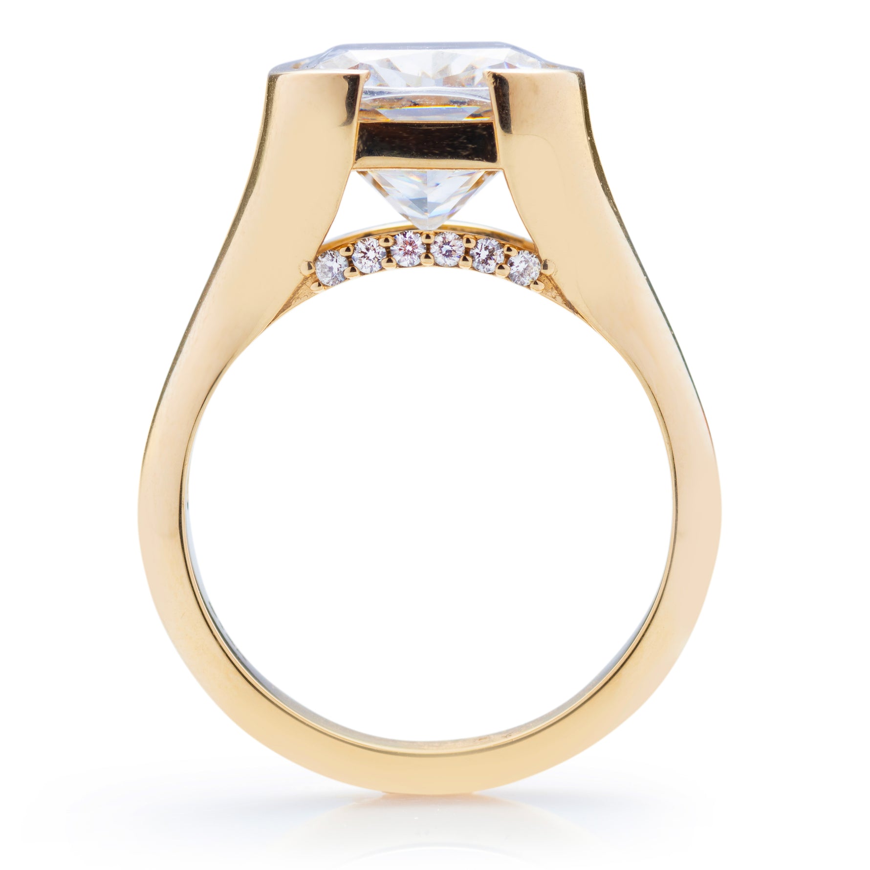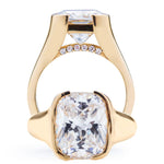 This engagement ring featured a cushion diamond center stone set in a half bezel. The bridge is also decorated with diamonds. Image shows a 6ct center stone.