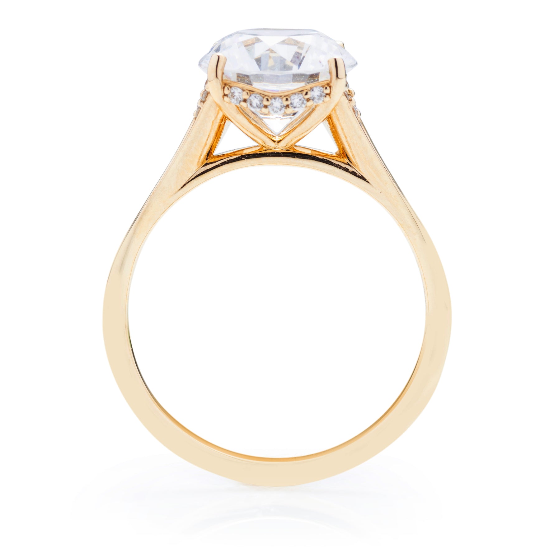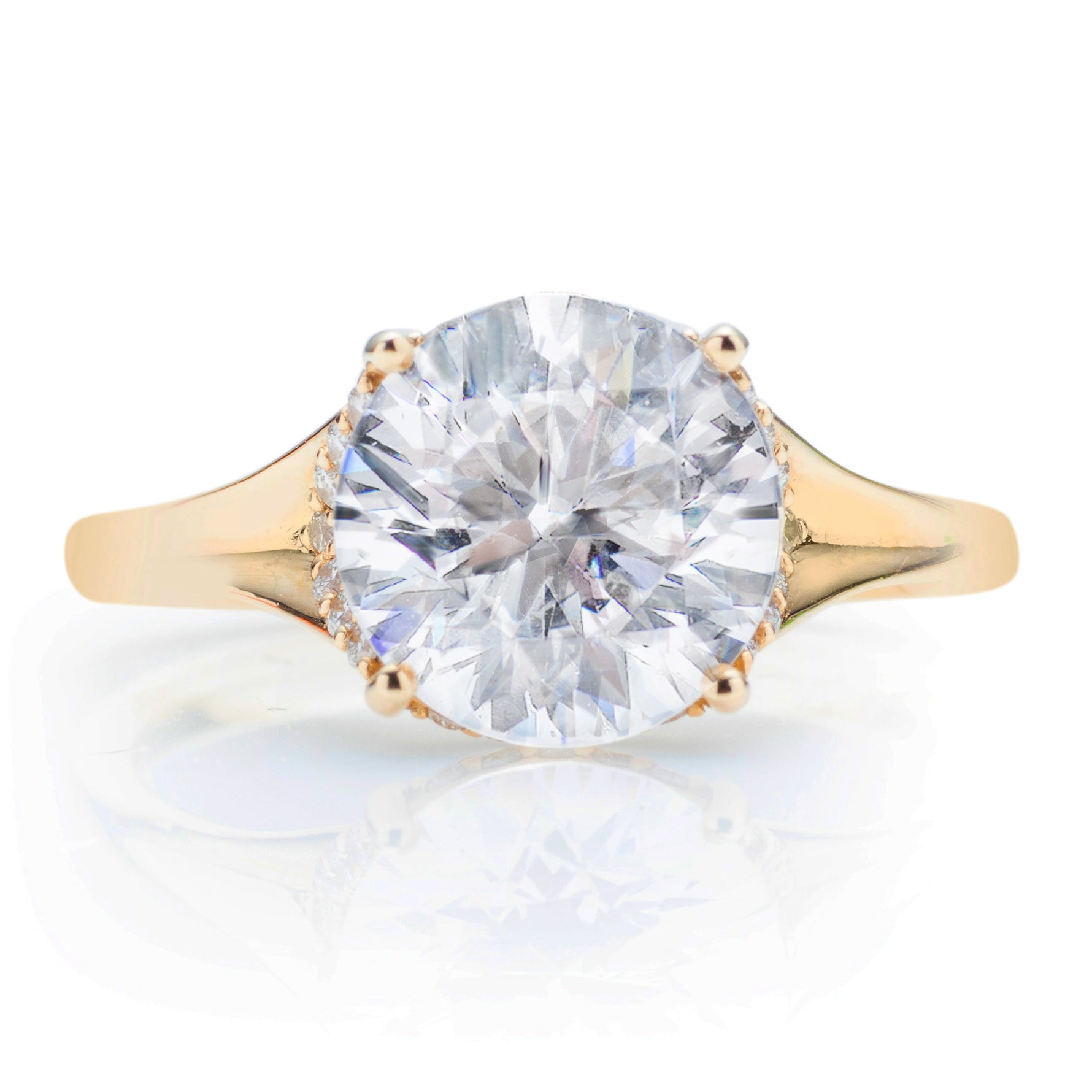Unit price perThis engagement ring features a round diamond center stone. The shank features a concave shank lined with diamonds. A hidden halo sits below the center stone to add a bit of extra special. Image shows a 2ct center stone.