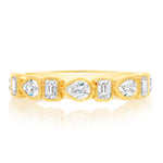 This halfway band features alternating pear and emerald diamonds halfway around the ring.