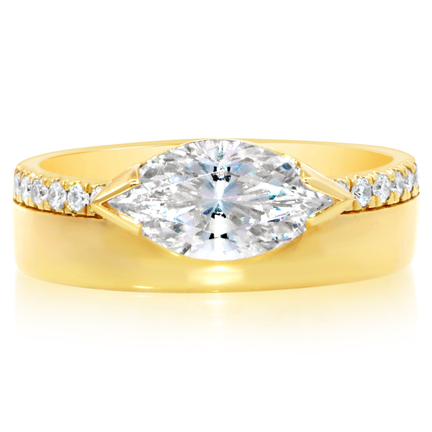 Unit price perThis engagement ring features a marquise center stone set east-west with partial bezel. The shank features a double band design with a high polish band and a split prong band. Image shows a 11x6mm marquise diamond.
