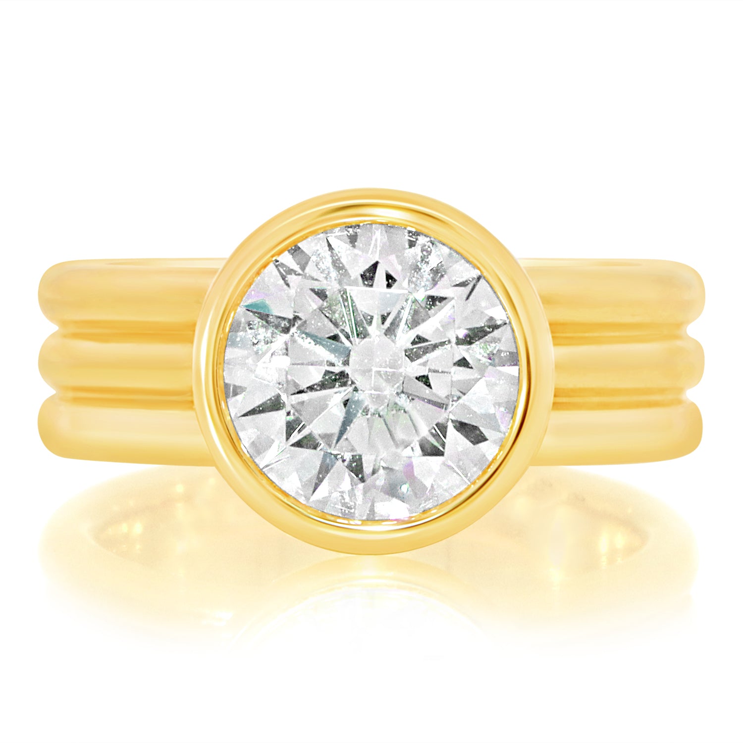 Unit price perThis is engagement ring features a round diamond which is bezel set. The shank features a triple row design with a thickness reminiscent of a cigar band. Image shows a 9mm center stone.