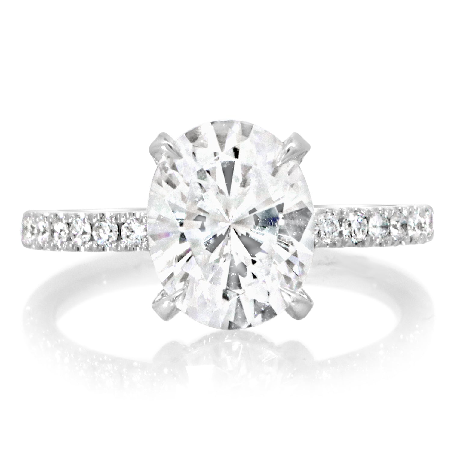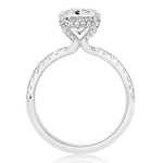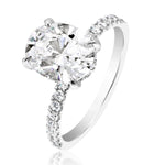 Unit price perThis engagement ring features an oval diamond center stone held with eagle claw prongs. The shank, prongs, and hidden halo are decorated with diamonds. Image shows a 10x8mm diamond.